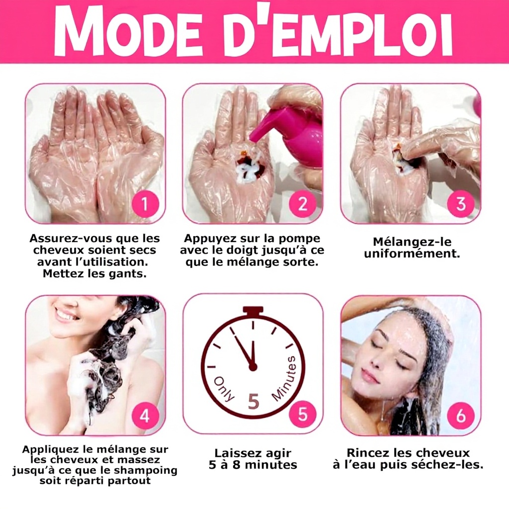 Appliquez sur cheveux humides, massez uniformément du cuir chevelu jusqu’aux pointes, laissez poser 5 minutes puis rincez abondamment à l’eau tiède jusqu’à ce que l’eau soit claire.
