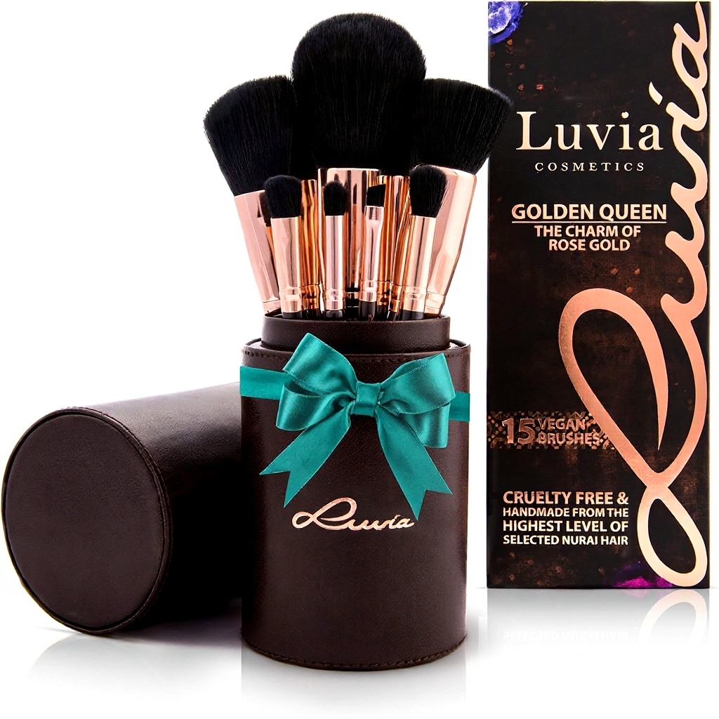 Ce set de pinceaux Luvia Golden Queen comprend 15 pinceaux à maquillage végans, fabriqués à la main avec des soies synthétiques Nurai spécialement ennoblies pour une application douce et précise. Les manches en brun chocolat et les viroles en or rose s’harmonisent parfaitement avec l’étui en satin inclus, offrant un look tendance et luxueux. Conçu pour répondre aux normes professionnelles, il assure une finition esthétique et régulière.