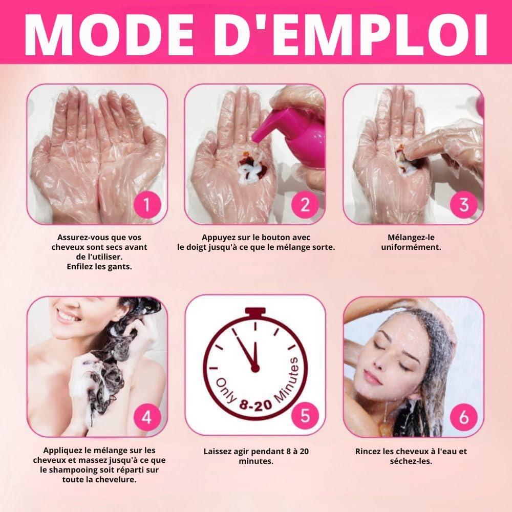 Il suffit de laisser poser le produit pendant 5 minutes sur cheveux humides après application et massage, puis de rincer abondamment pour obtenir une couverture optimale.